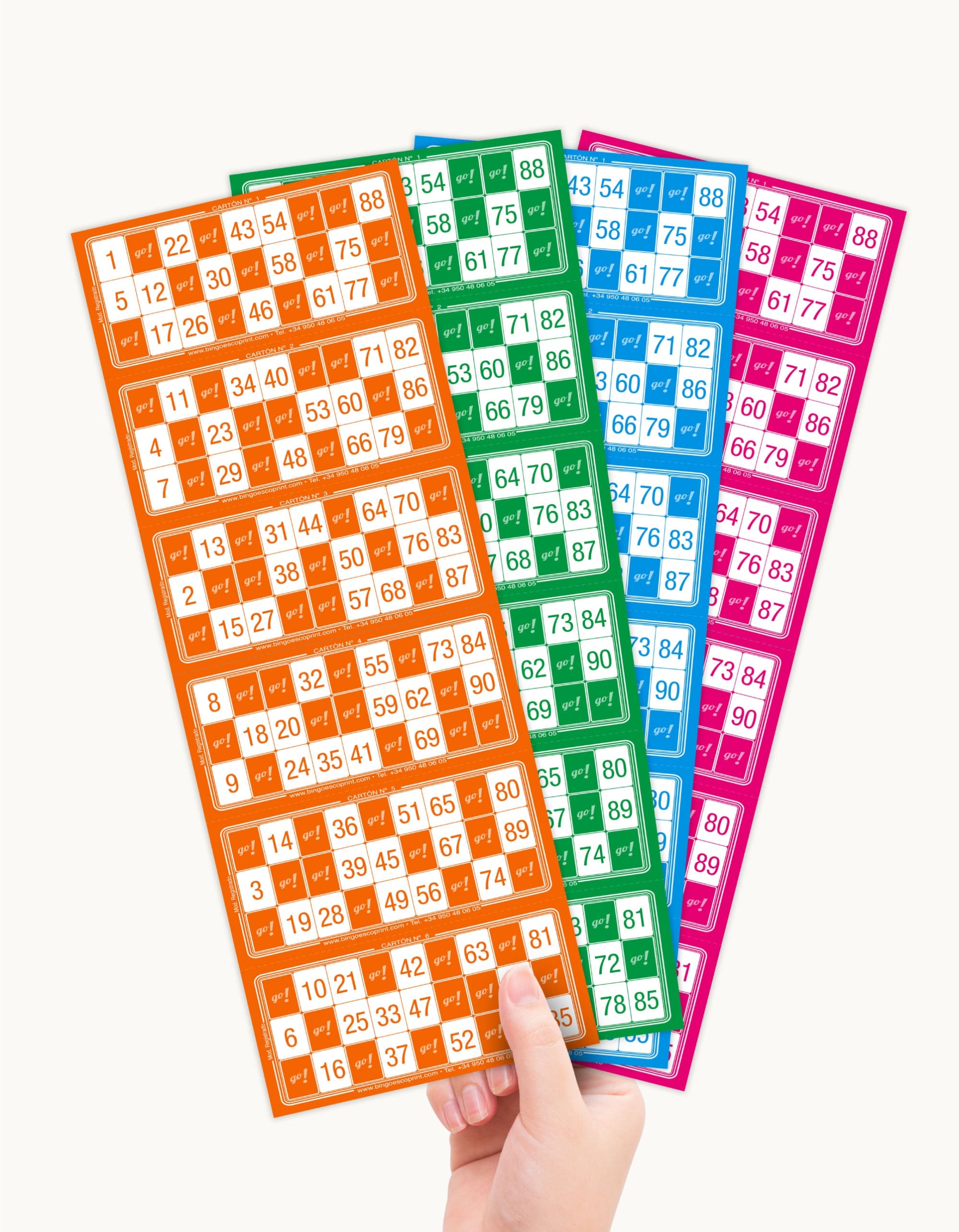 Cada tira de 6 cartones contiene los 90 números del bombo de manera que si jugamos los 6 cartones podremos marcar en todas las tiradas. En la placa no hay ningún número repetido.